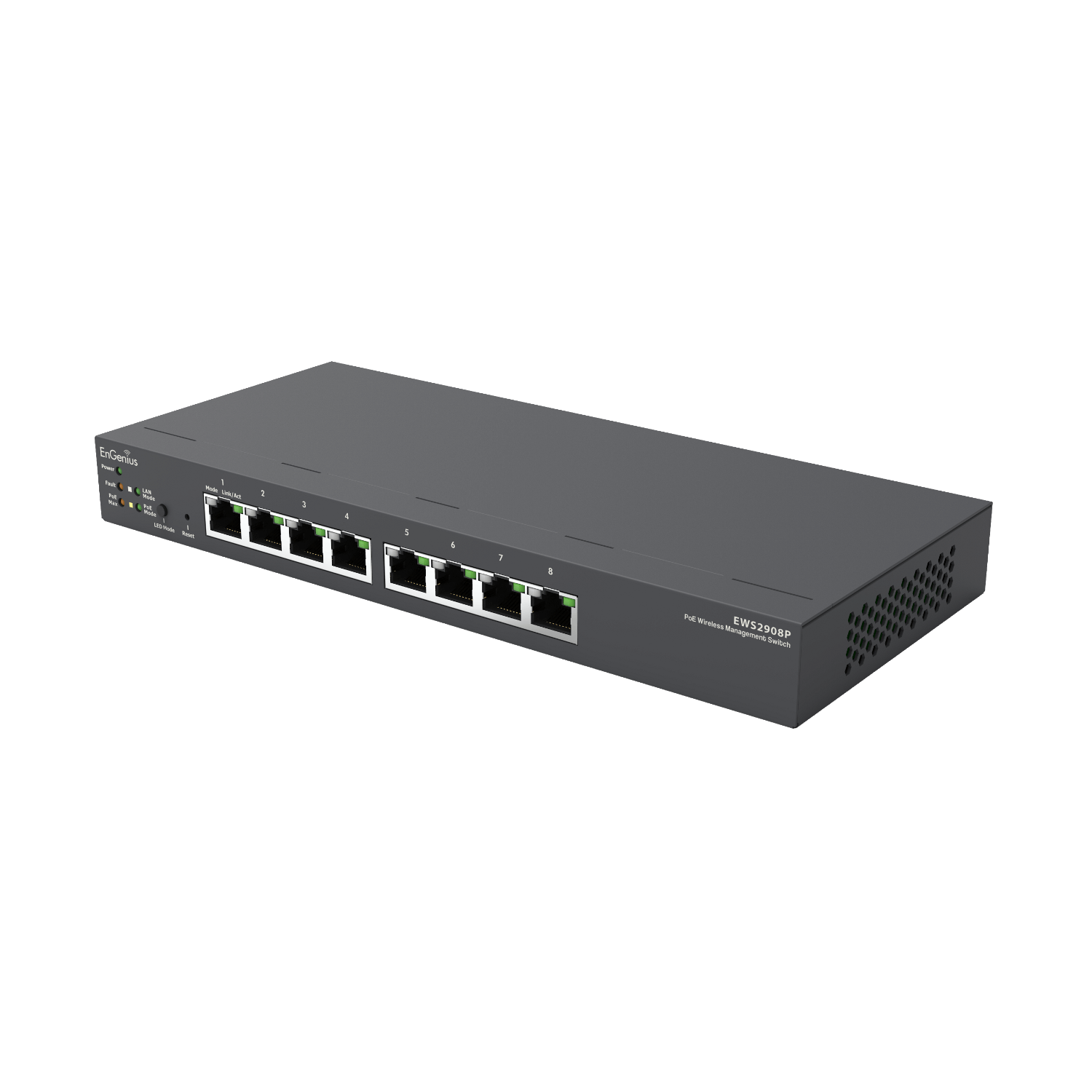 EnGenius EWS2908P – настольный 8-портовый маршрутизатор с возможностью распределения электропитания (стандарт PoE IEEE 802.3af) и раздачи интернет-канала по кабелю компьютерам, ноутбукам, веб-камерам и др. Контроль системы проводится при помощи веб-сервиса или установленной автономно программы ezMaster. Автономное ПО входит в комплектацию оборудования, для использования веб-ресурса платная подписка не требуется.