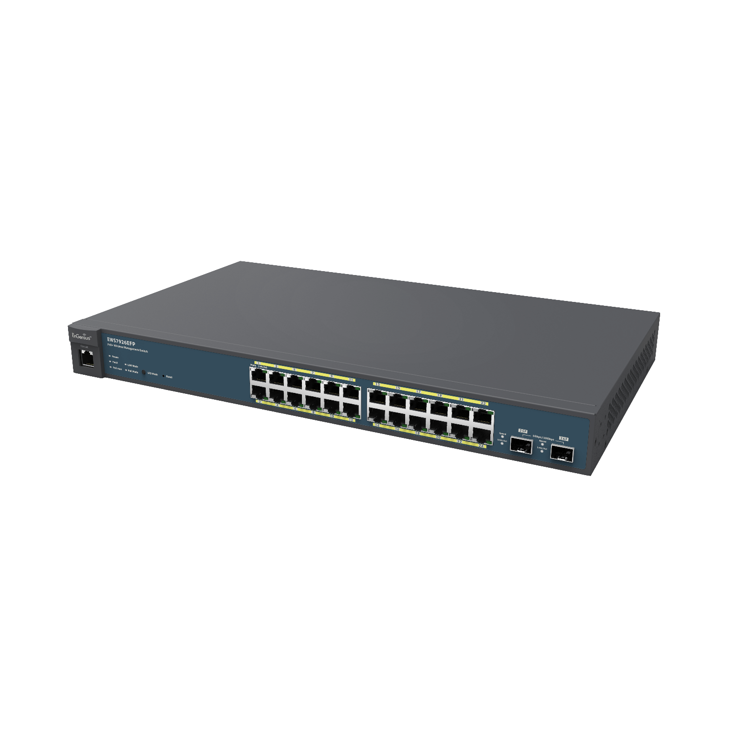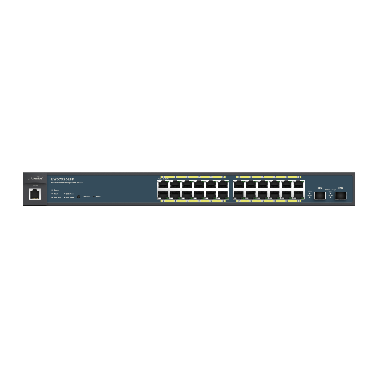 Мощный EnGenius EWS7926EFP – 24-х портовый маршрутизатор 2 уровня для подключения к интернету по витой паре к кабелю компьютеров, ноутбуков, веб-камер. Для подсоединения потребителей есть 24 Ethernet-разъема с пропускной способностью 1 гигабит/c. Скорость подключения по SFP-каналам составляет 10 гигабит/c. Для соединения с линией провайдера при помощи витой пары предусмотрен интерфейс SFP, RJ-45.